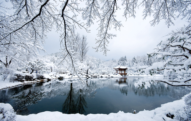 Garden of Morning Calm ở Hàn Quốc là một khu vườn thực vật đẹp mê hồn với sự kết hợp giữa cảnh quan thiên nhiên và kiến trúc truyền thống Hàn Quốc. Du khách có thể thưởng ngoạn những lối đi dẫn qua các khu vườn, hồ nước và đài phun nước, tạo nên không gian thơ mộng và tuyệt vời để tận hưởng vẻ đẹp mùa đông.